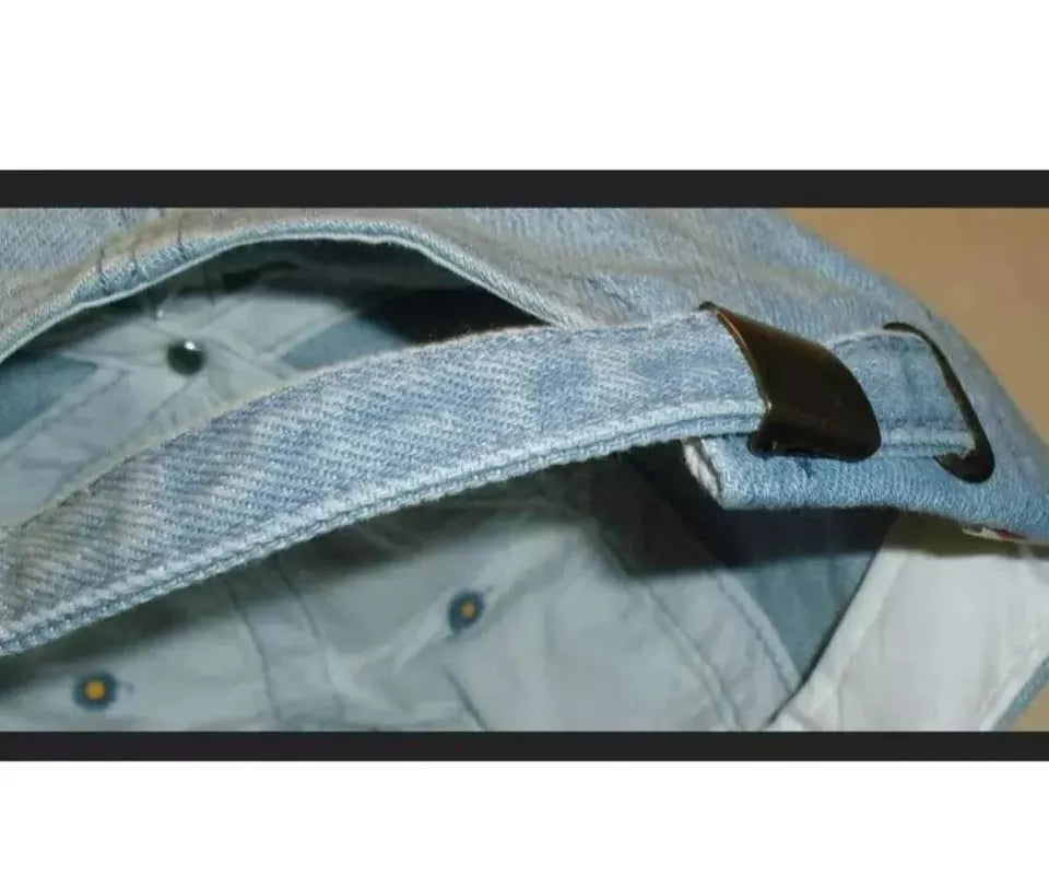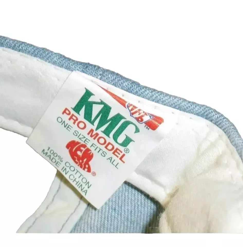 Brand New Vintage Original 90s New Era KMG Pro Model Indianapolis Colts Adjustable Strapback hat. The front hat the embroidered Colts shield logo on it. The back has the adjustable strapback strap on it. This is all light denim material with parts of the hat has a tinge of the dirty denim color to it. It is in Brand New condition. Made by New Era KMG Pro Model.