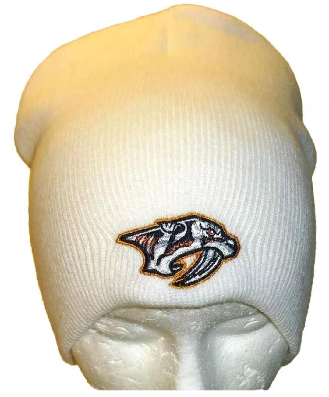 Nashville Predators Adult Sized One size fits all White Winter hat beanie. The front has the embroidered Predators logo on it. This is Brand New.